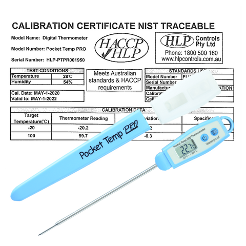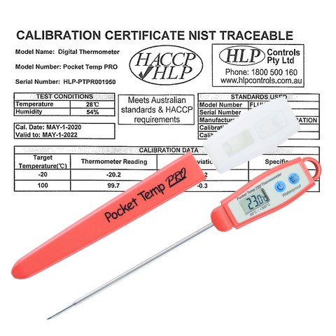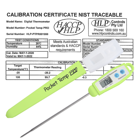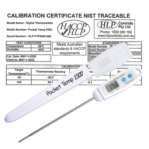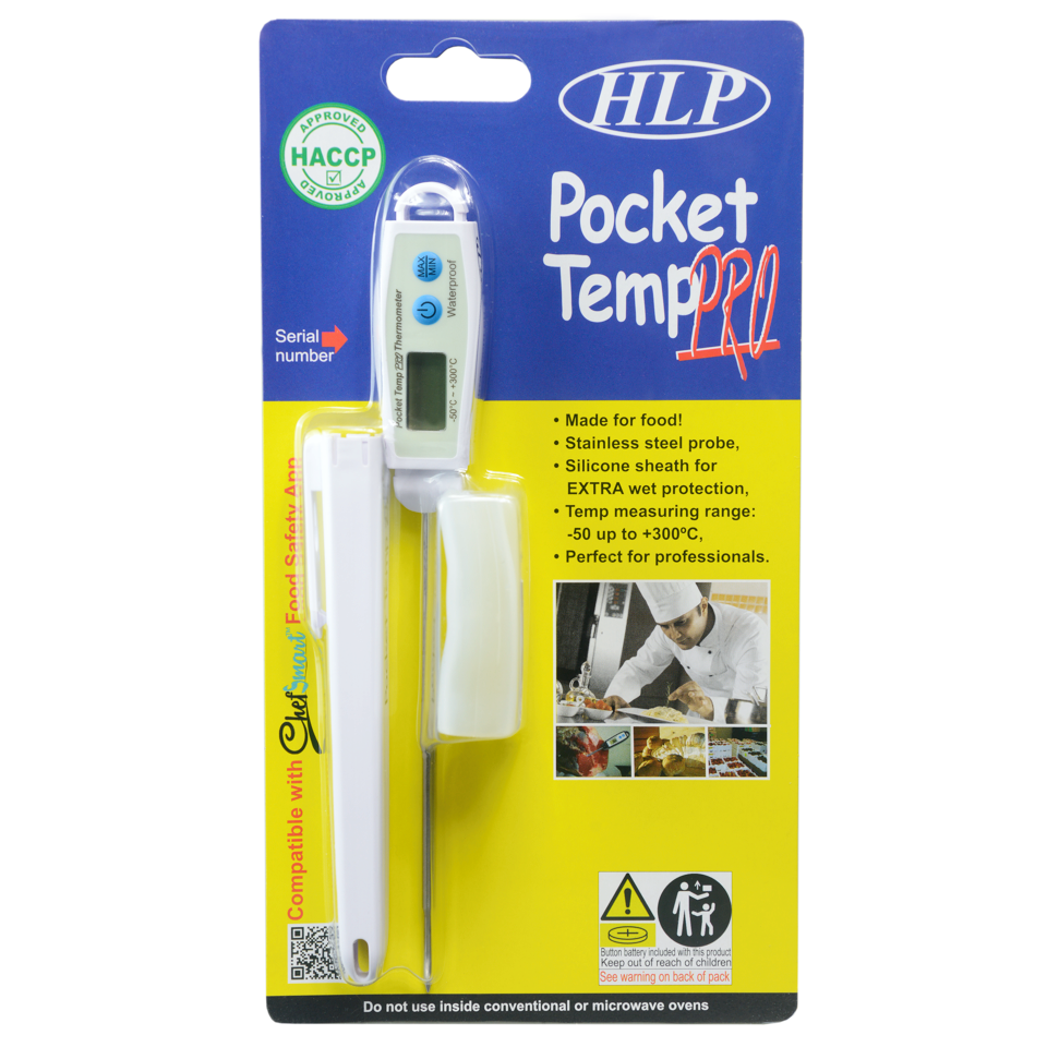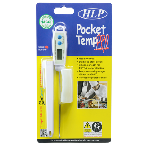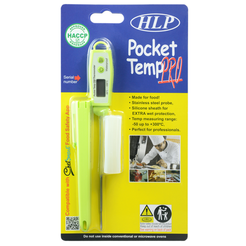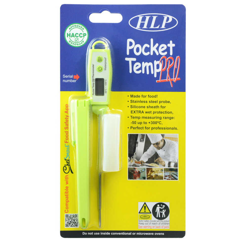 The Pocket Temp Pro is a Food Grade Stainless Steel Digital Probe Thermometer with a Unique Serial Number, the unit is Waterproof and great for a range of applications. The unit meets all of the HACCP Food Safety Standard requirements. Complete with FSANZ standards Food Safety temperature chart on the pack.