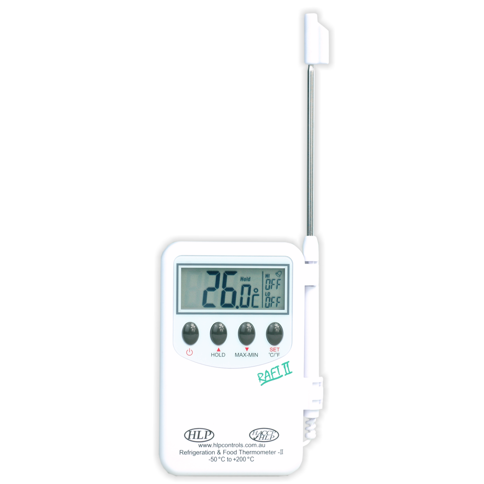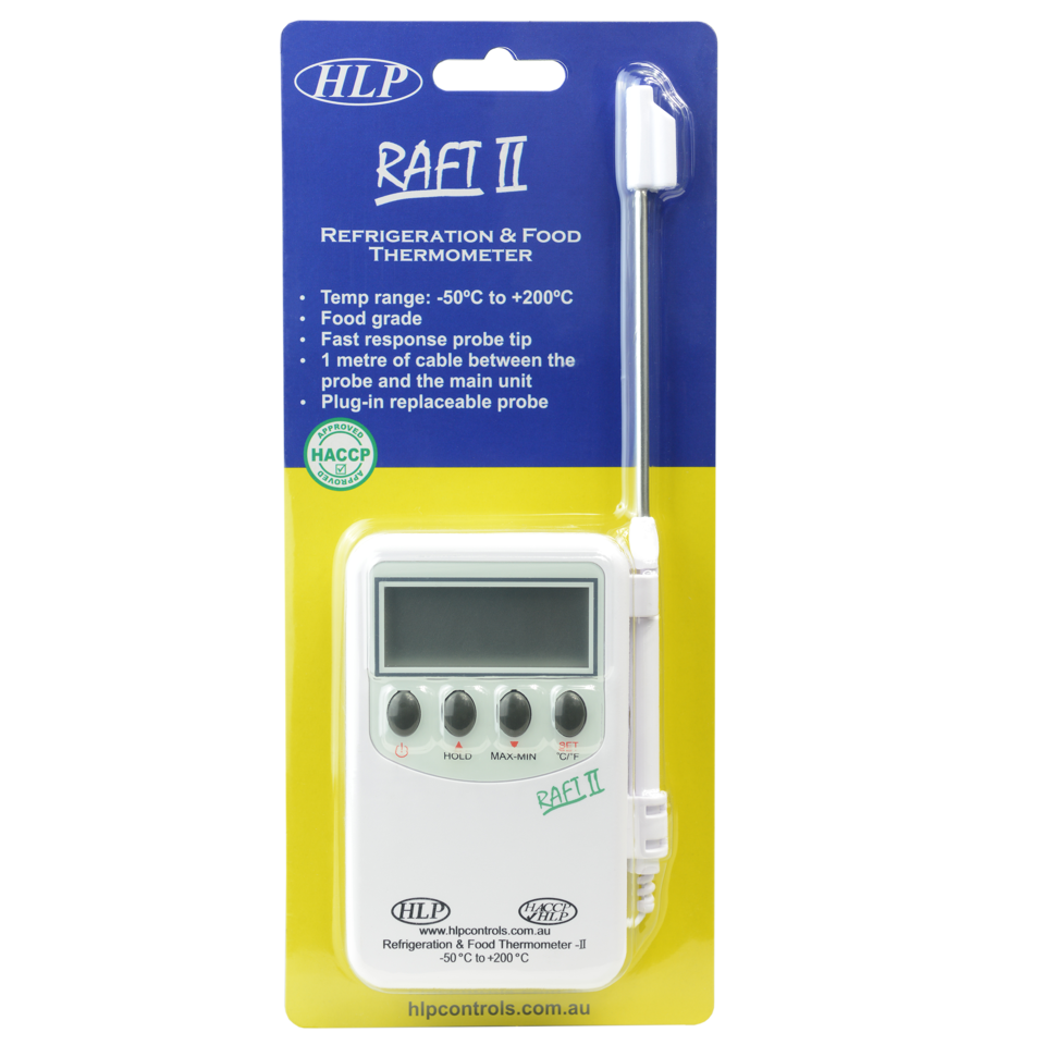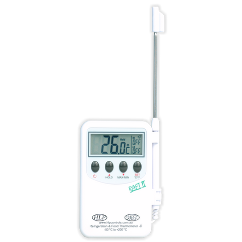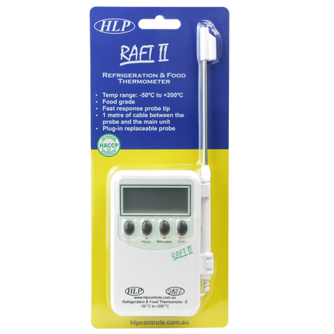The RAFT II (Refrigeration And Food Thermometer) is a handy, pocket sized, Food Grade Digital Probe Thermometer with an External Probe, on a 1m Cable. The unit has an audible alarm, and can be used for temperature breach alarming in fridges & freezers, and is one of our most popular, versatile units.